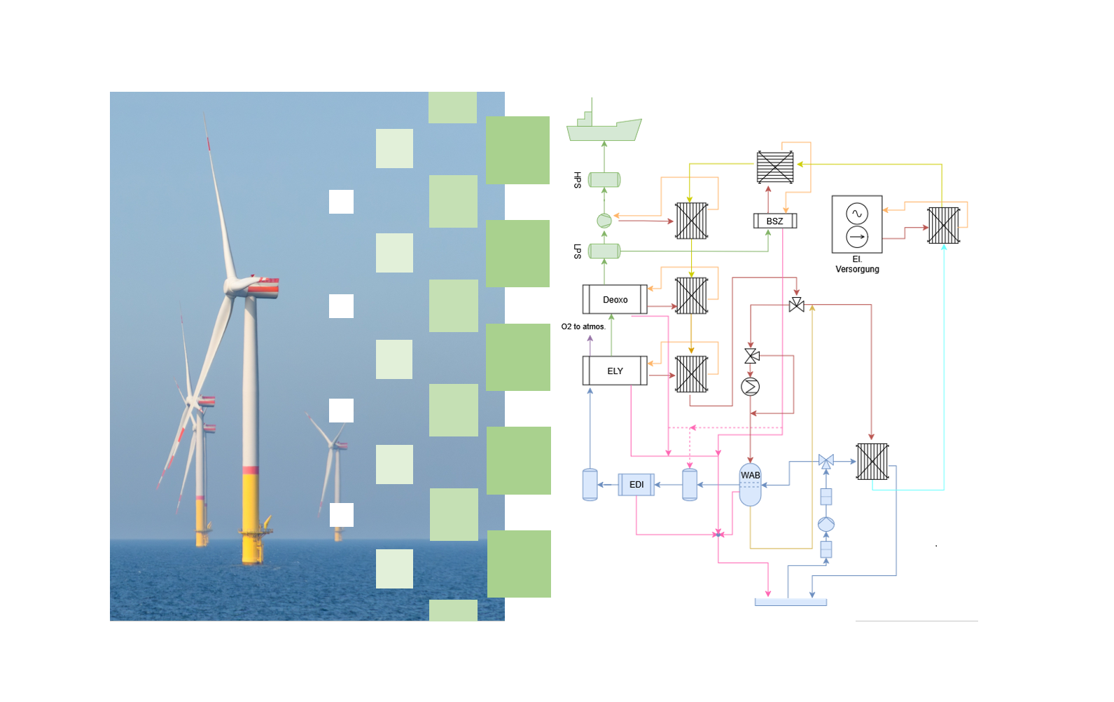 Die Hochschule Bremerhaven befasst sich mit allen Aspekten der verfahrenstechnischen Auslegung der Plattform. Das finale Plattformkonzept soll im Bereich von 1 bis 500 Megawatt skalierbar sein und alle relevanten Komponenten für die effiziente Produktion von grünem Wasserstoff umfassen. Um dies zu erreichen wird mit der Bestimmung aller notwendigen Komponenten und der Ermittlung der Anforderungen an diese, bedingt durch die anspruchsvollen Bedingungen im geplanten Einsatzgebiet, begonnen. Anschließend werden die prozessrelevanten Komponenten in ein Simulationsmodell überführt und, sofern möglich, anhand von Realdaten validiert. Dies dient als Grundlage für mögliche Effizienzverbesserungen durch die rekuperative Nutzung von Prozessnebenprodukten. Die abschließende Bewertung des Plattformkonzepts erfolgt anhand möglicher CO2-Einsparungen sowie Kostenermittlungen verschiedener Skalierungen.